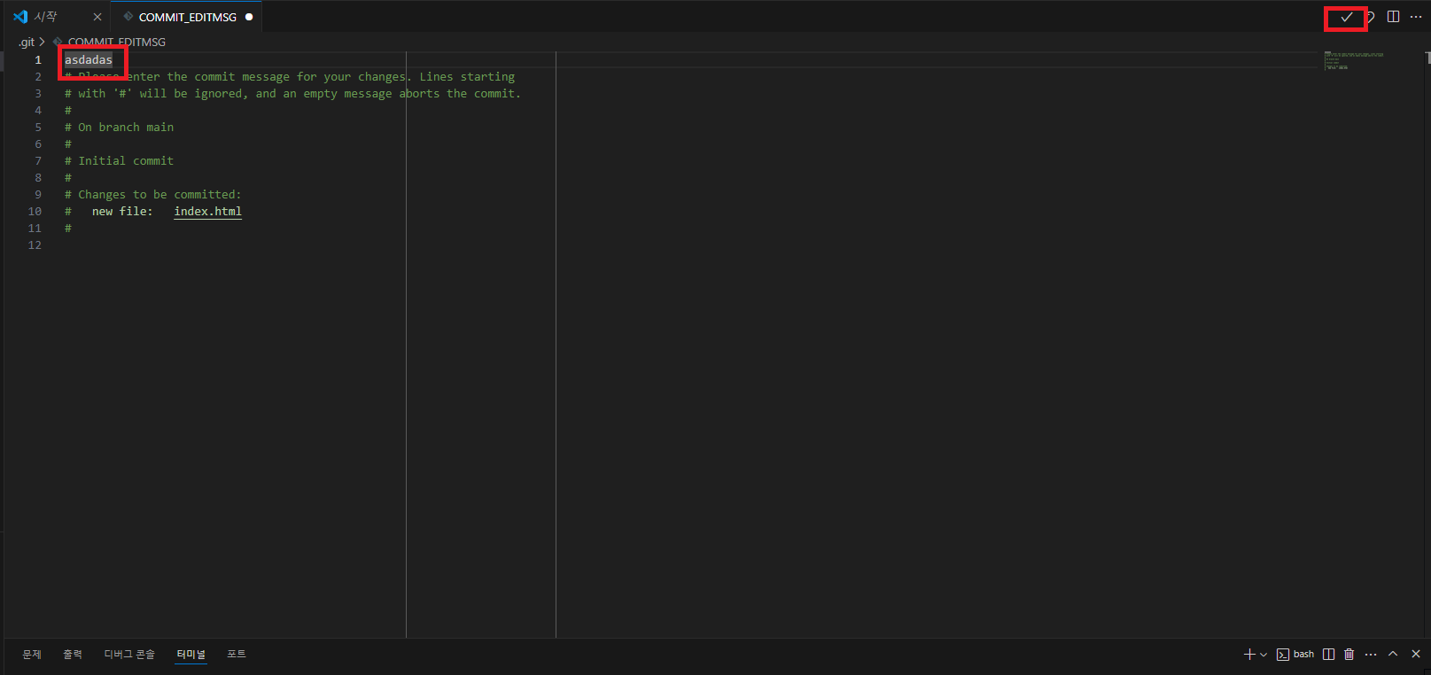 커밋 누르면 아래같은 화면 나옴 터미널 켜주고 명령어 입력 > 다시 커밋