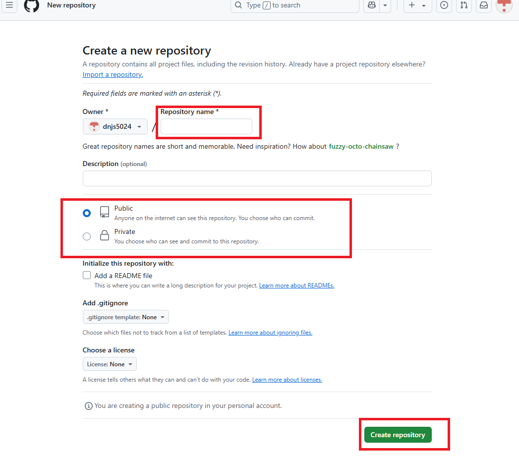게시 Branch 누르고 Private or public 선택 후 프로젝트명 입력해준다