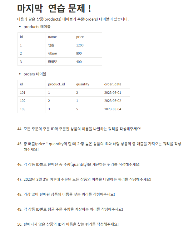 45. select o.product_id as id , sum(o.quantity * p.price) as 총매출 from orders2 o , products2 p
